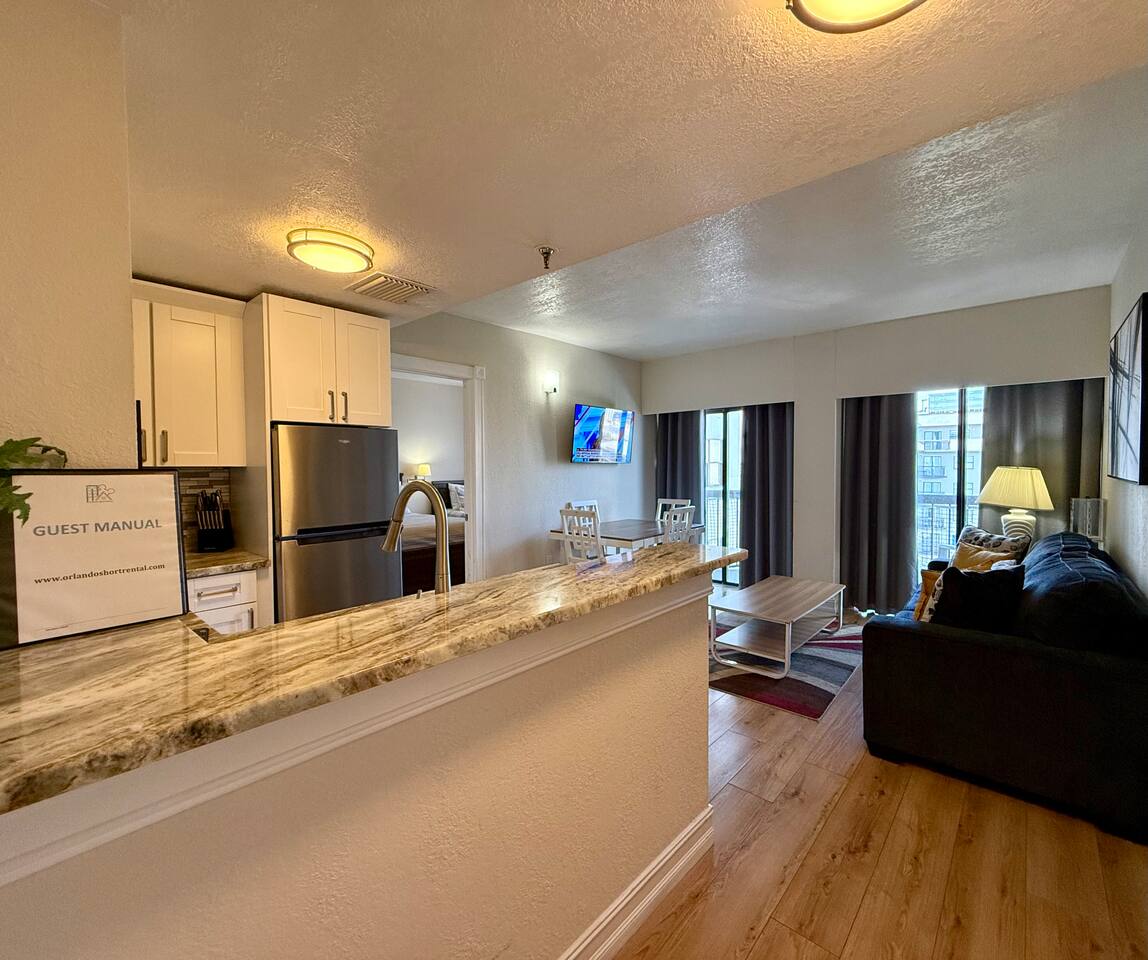 The apartment is perfectly located, surrounded by countless restaurants and just moments from top International Drive attractions such as Madame Tussauds, SEA LIFE Aquarium, and the Orlando Eye. You’ll also be within easy reach of Orlando’s world-famous theme parks: Walt Disney World’s 4 parks – only an 18-minute drive Universal Studios, Epic Universe, and Volcano Bay – about 8 minutes away SeaWorld – just 10 minutes away Disney Springs – only 15 minutes away If shopping is on your list, you’ll love the proximity to the Mall at Millenia (9 minutes) and the Premium Outlets (5 minutes). Traveling without a car? No problem — Uber and taxis are easily available and offer a convenient way to reach all major attractions.